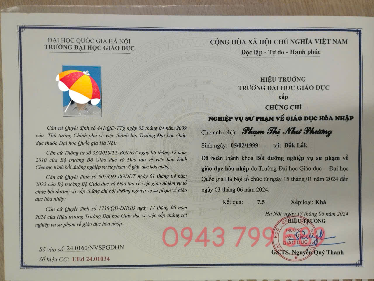 Chứng chỉ Nghiệp vụ Sư phạm Giáo dục Hòa nhập – Cấp bởi Trường Đại học Giáo Dục, Đại học Quốc gia Hà Nội